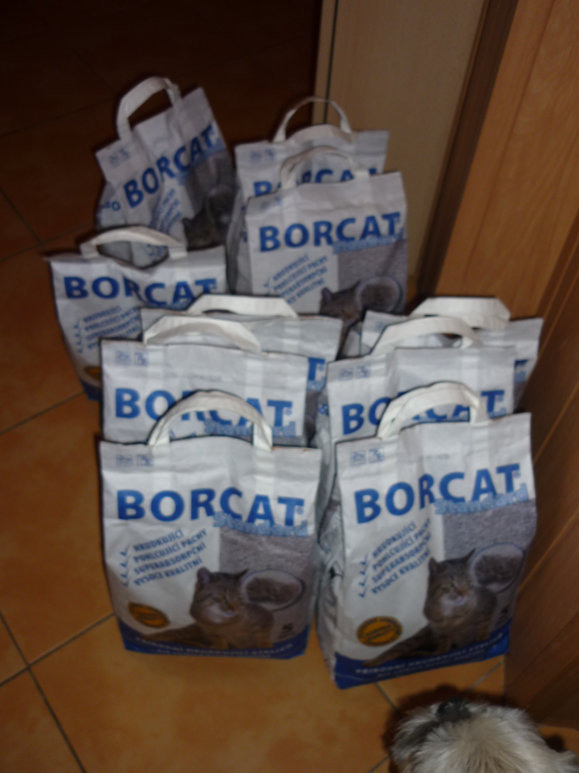 Jana Zítková přijela pro kocourky s kamarádkou Janou Patzenhauerovou a přivezly kočičkám deset pytlů kočkolitu. Moc užitečný dárek, děkujeme za něho!U Sluníčkové Janinky jsme dneska zjistili, že je opravdu již hodně stará, jak bylo původně řečeno její krmičkou. Janinčina vizáž díky její hezké srsti klamala. Zkoumali jsme to na popud Terezky, která při včerejší návštěvě Janičku hezky nafotila a v jejích očích viděla hodně hnědých teček, které věkem v oku přibývají. Zkusila jsem tedy opatrně prozkoumat její chrup a chuděra má jen dva horní špičáky, ošklivé stoličky a i nějaká jí chybí. Přesunuli jsme ji do jiné voliéry, kde dostává do jídla antibiotika na zánět dásní. Uvidíme, jak léky zaberou a zda by se nemusely zoubky vytrhat. Až si Janička ve voliéře zvykne, nikdo ji tam nebude rušit, rozplete se ji vzadu kousek pletiva a bude moci chodit ven. Necháme ji ve Sluníčku dožít.