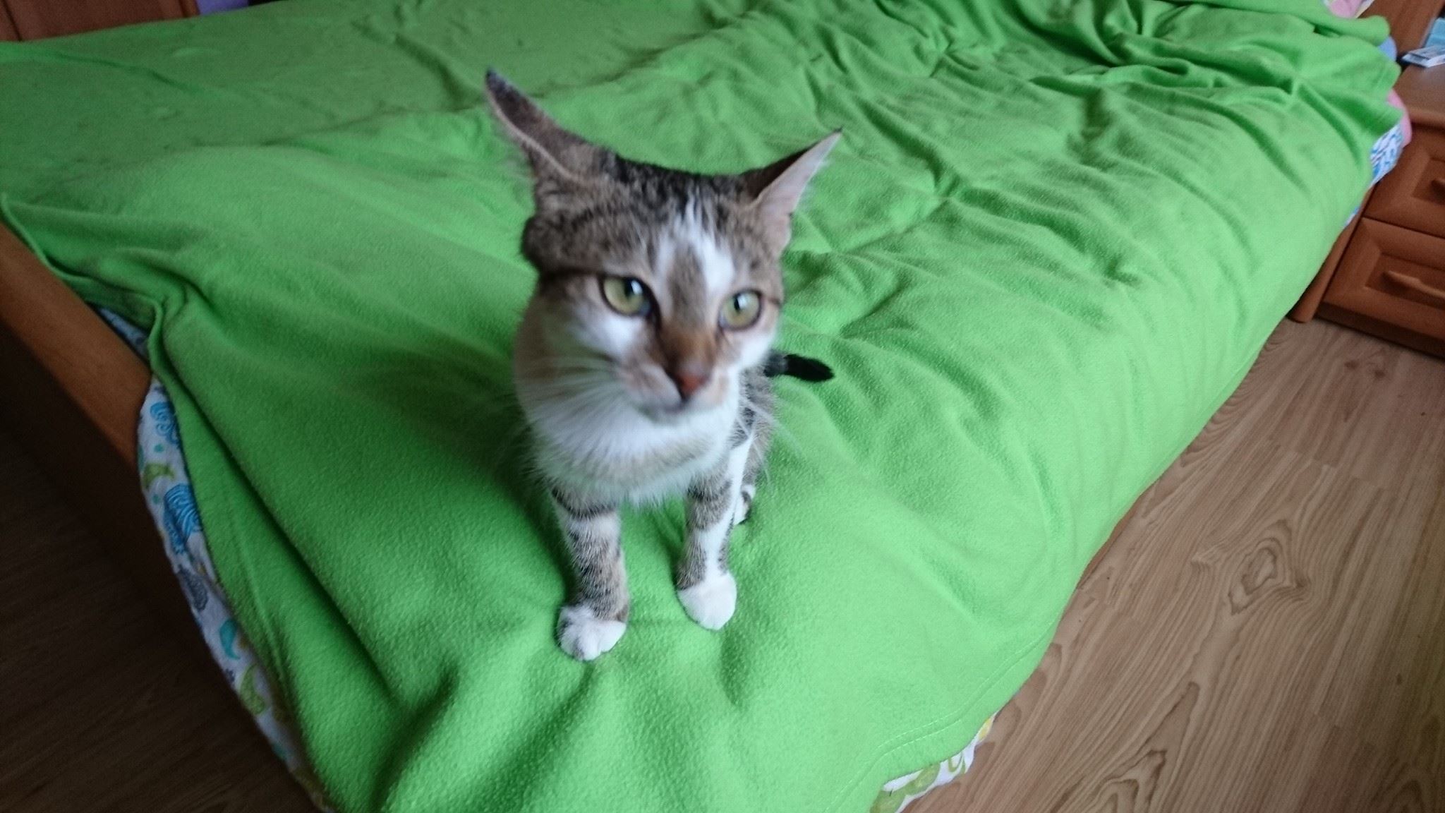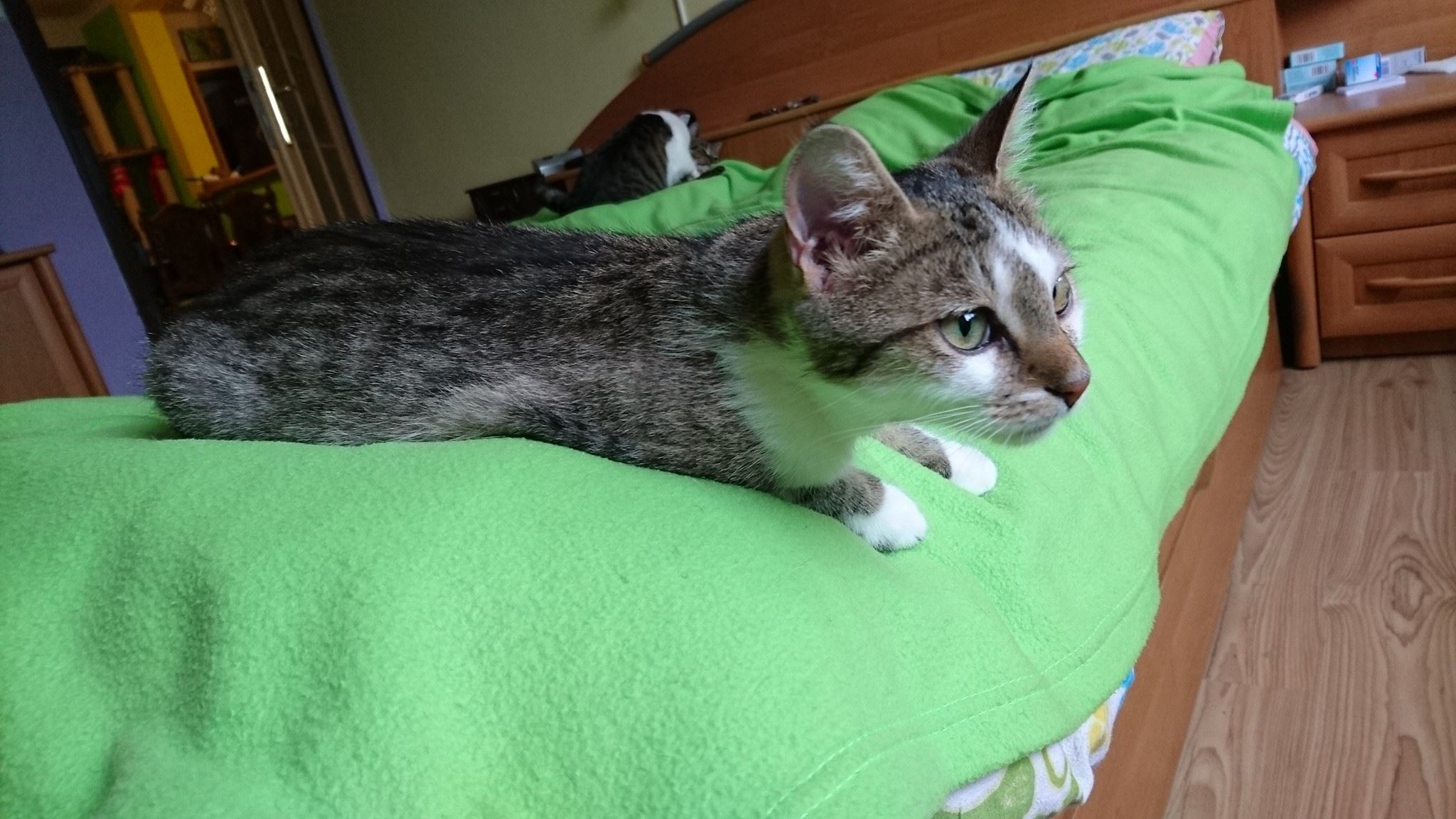 Černobílá Stánička je jedna ruka s bílomourovatou Irenkou, lítají po domě, perou se, je to teda dvojka. Holky jsou stejně staré a obě užívají antibiotika. Stánička začala zase prskat a Irence teče z očička. Holkám to však na temperamentu neubírá. Nejvíc je zajímá malý Bořeček. Toho by nejradši učily lotrovinám a k tomu ho sami lovily. Irenka vede.