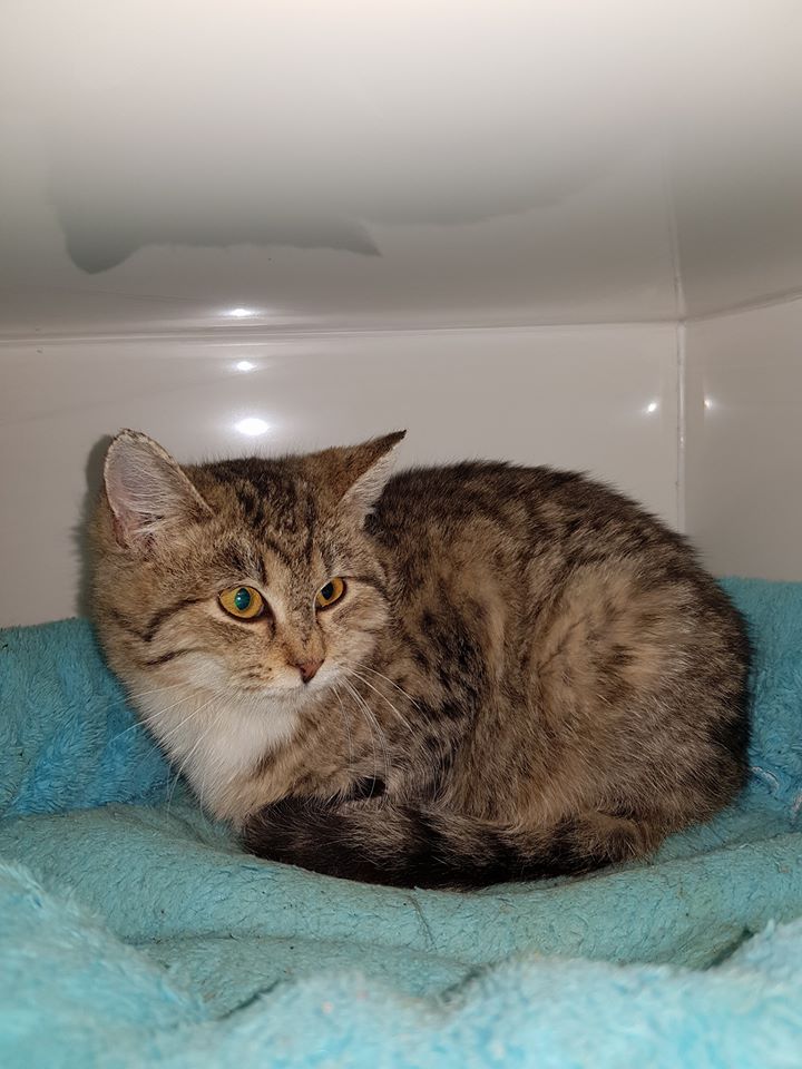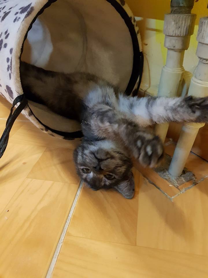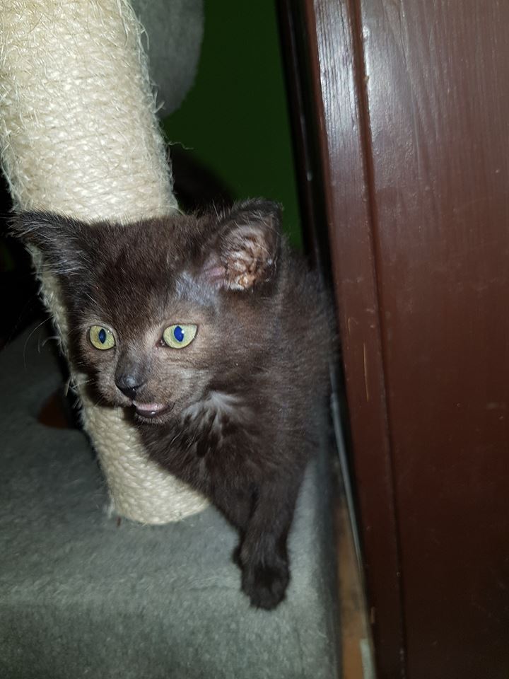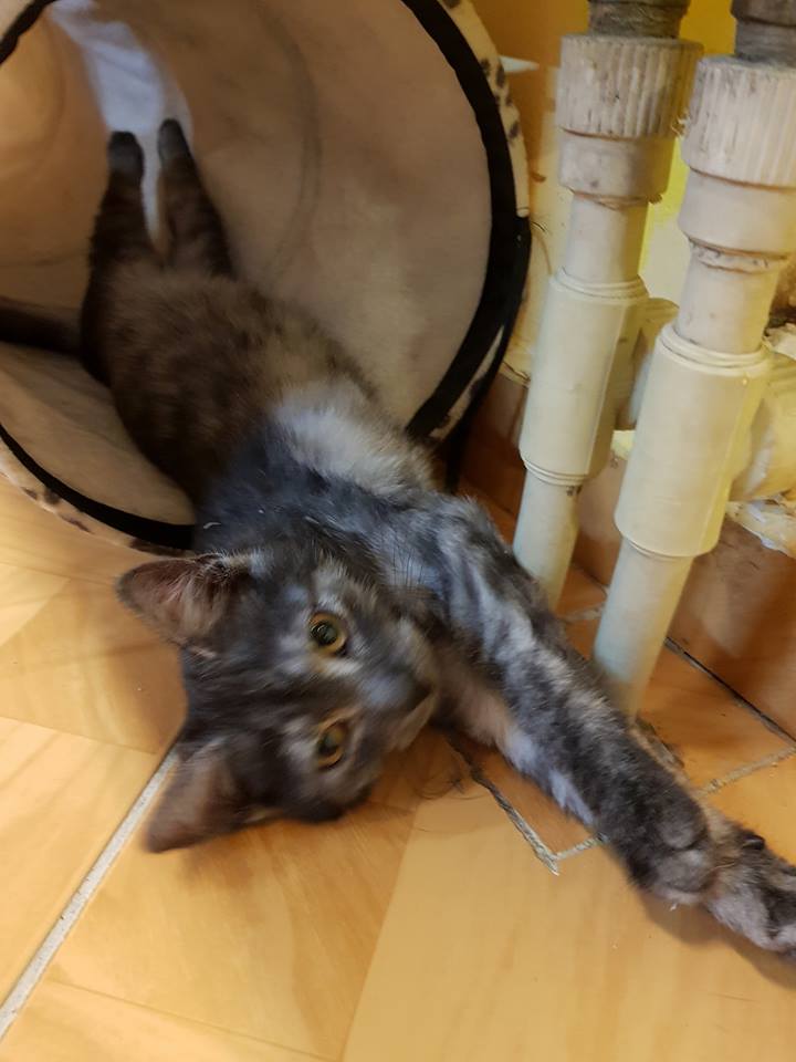 Vrácené kotě z adopce Podléška neustále na všechny syčí. S lidmi se kámoší, ale koček a i koťat se bojí.