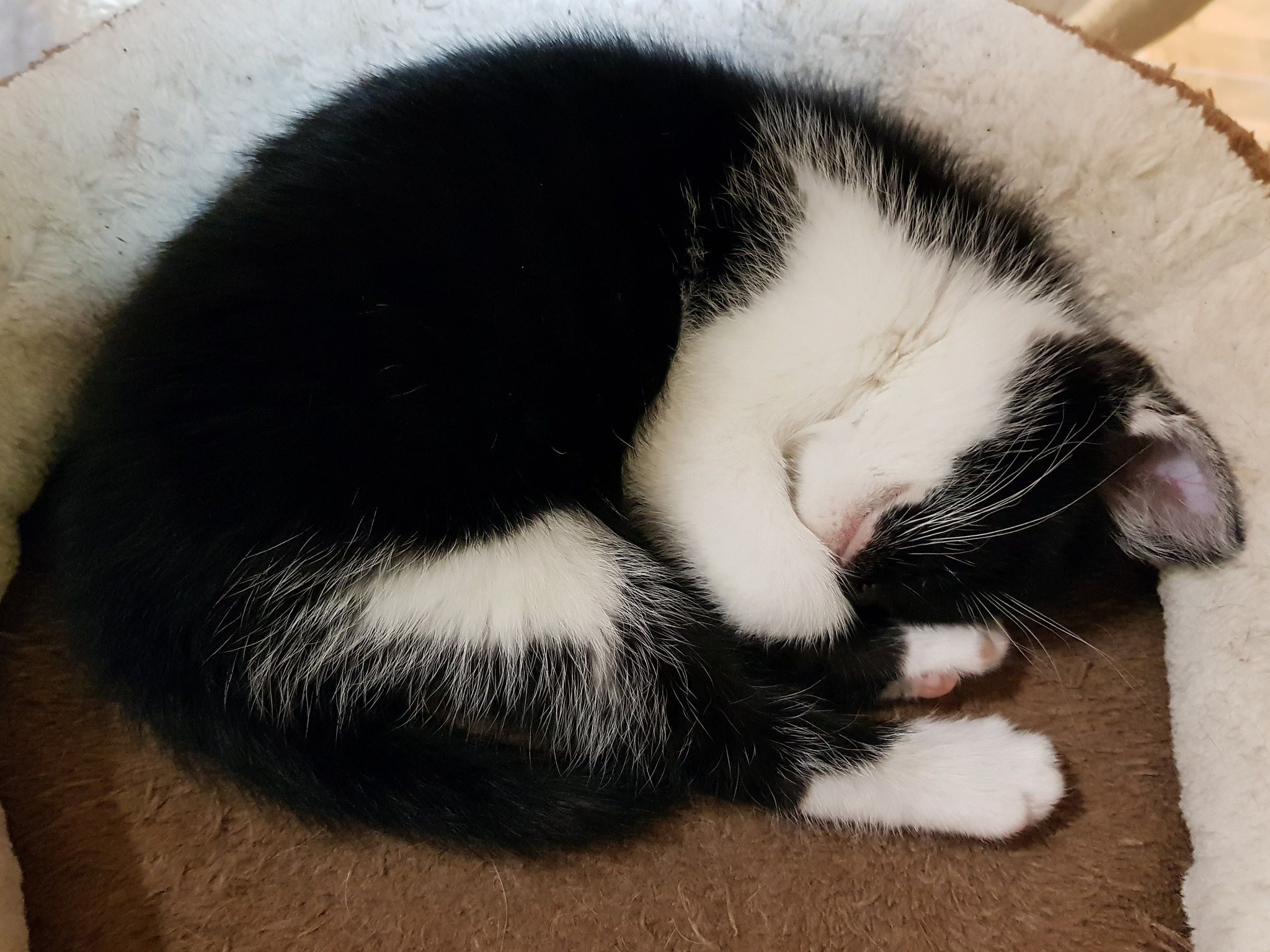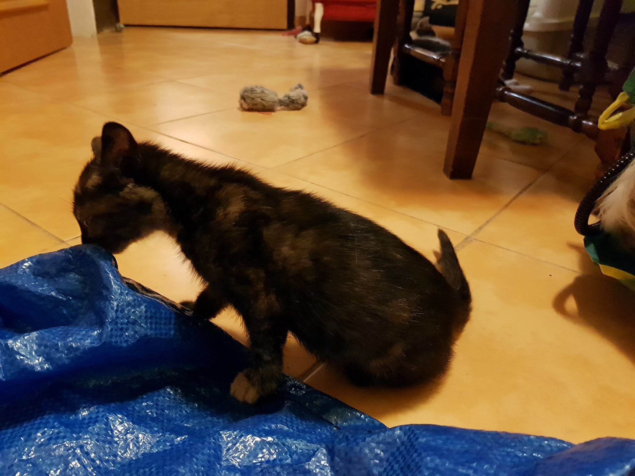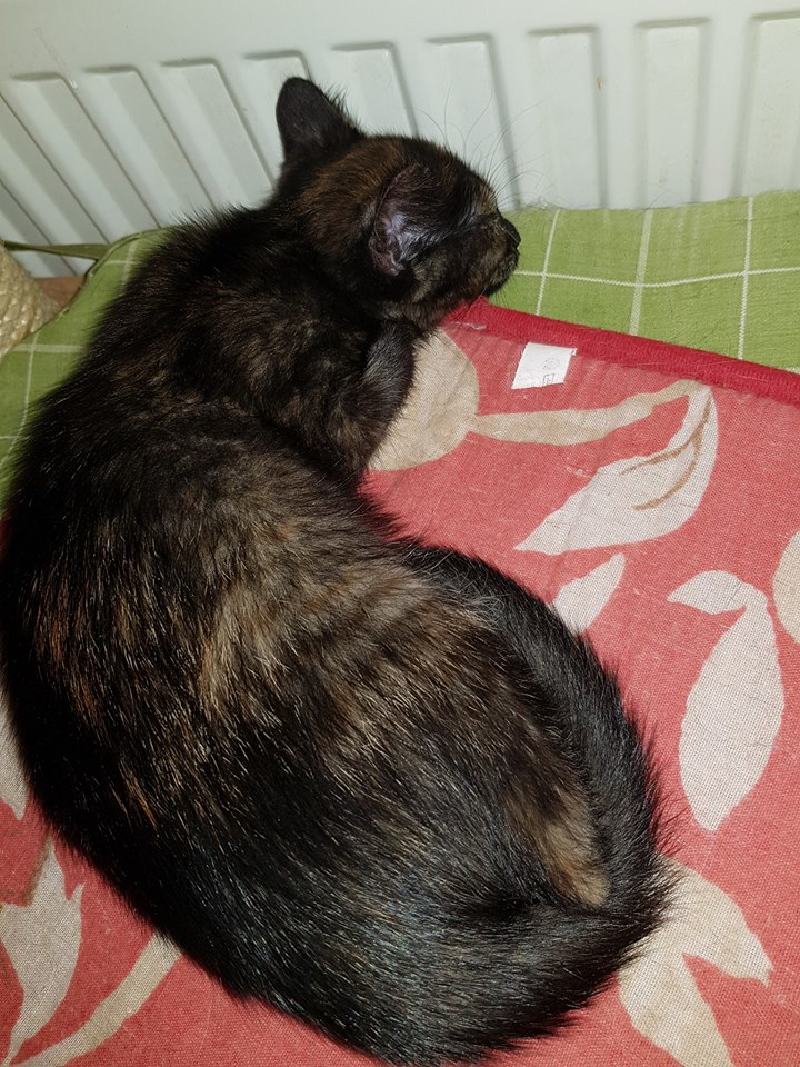 V sobotu nalezené černé kotě – holčička už dostala jméno a to Lékořička. Měla unudlaný nosánek. Rýma pomalu ustupuje.
