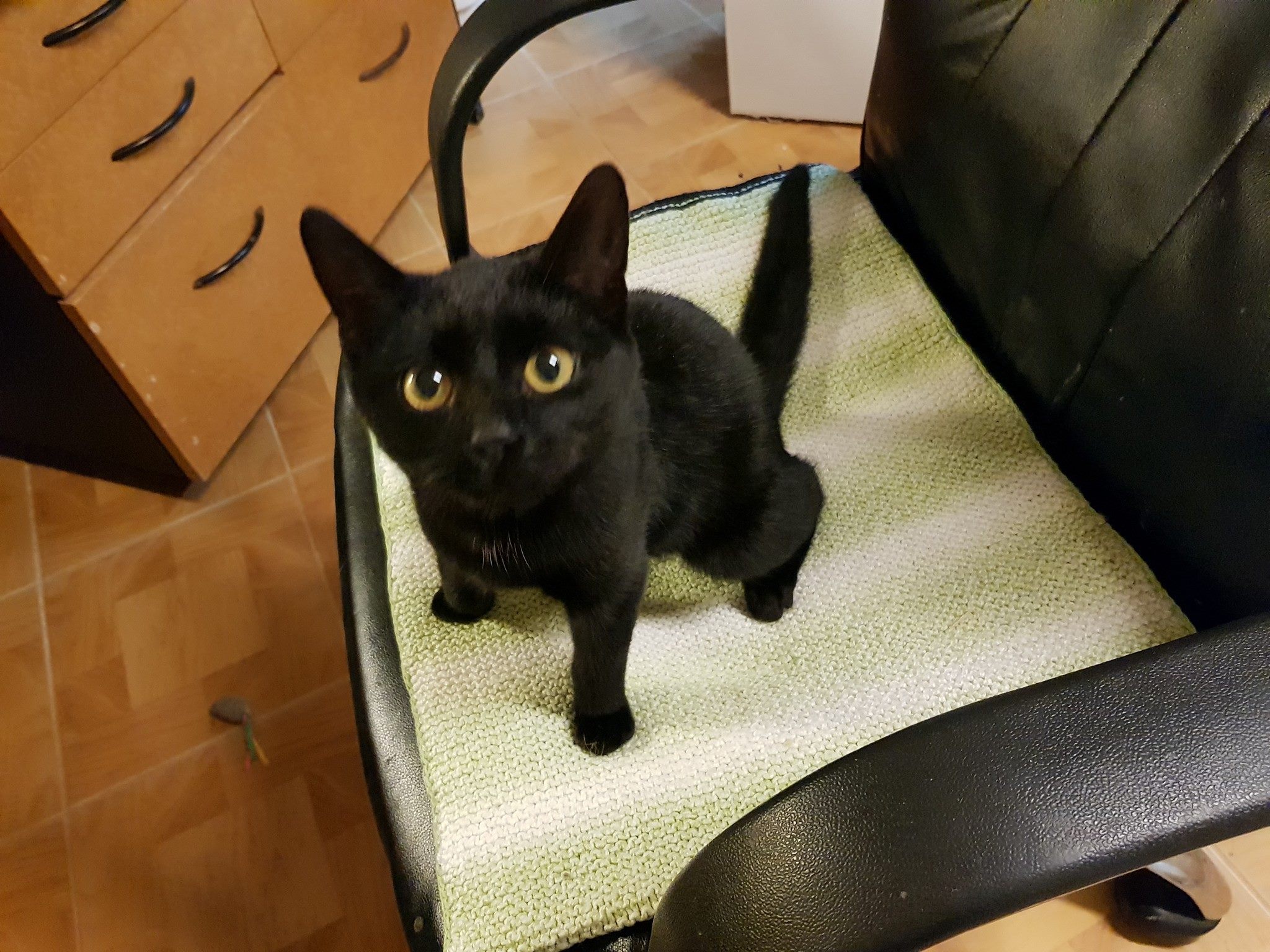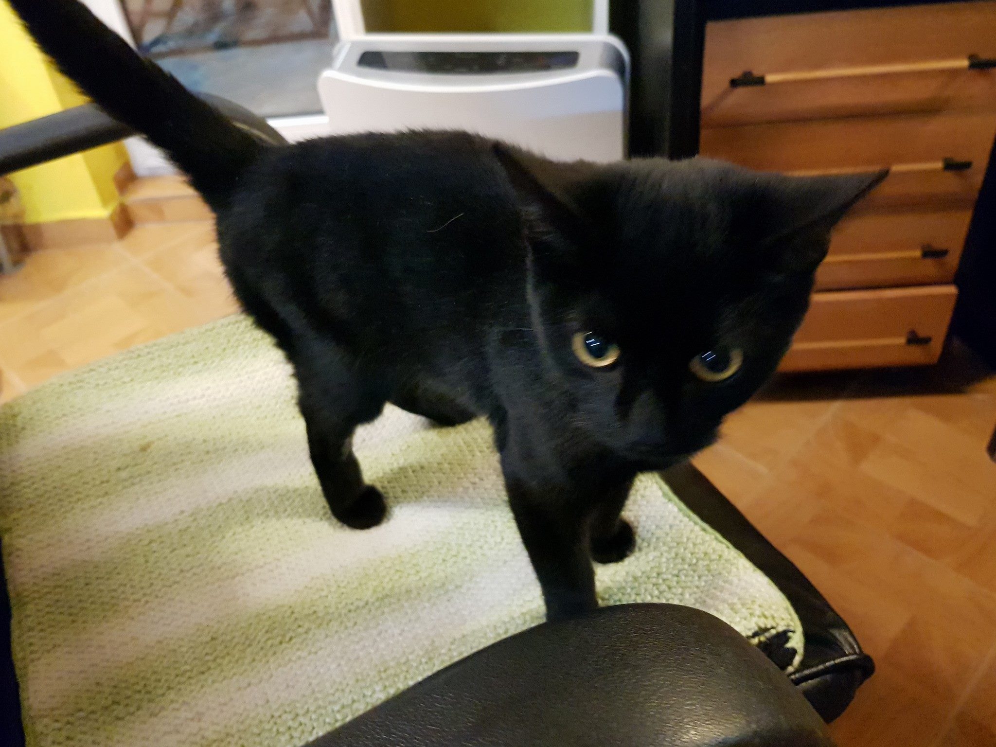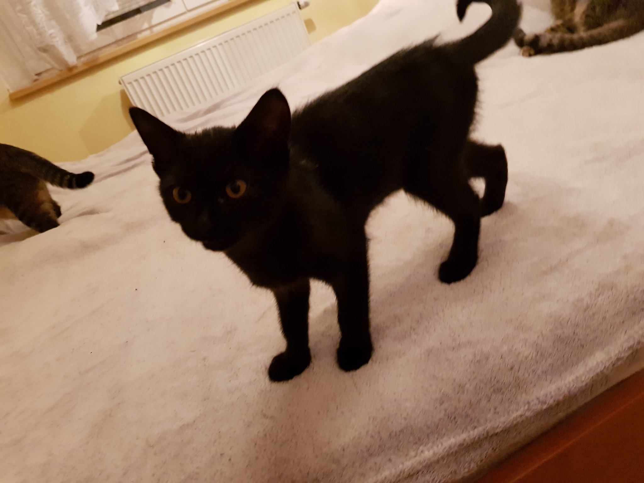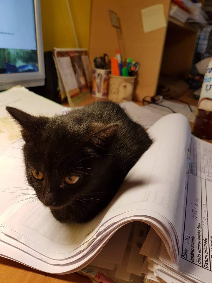 Černé, malé kotě Loretka je kluk, takže jméno měníme na Loretek. Dělá mi starosti, vypadá sice baculatě, ale moc nejí. Bude delší dobu odčervován.