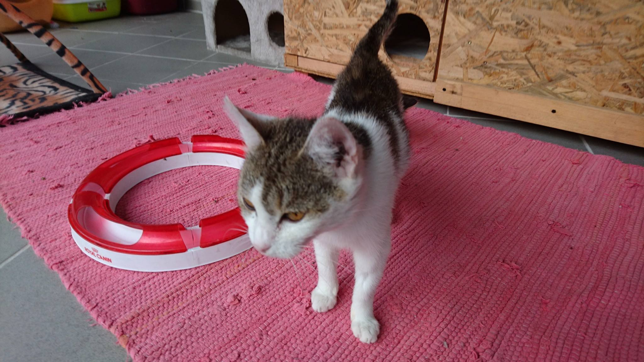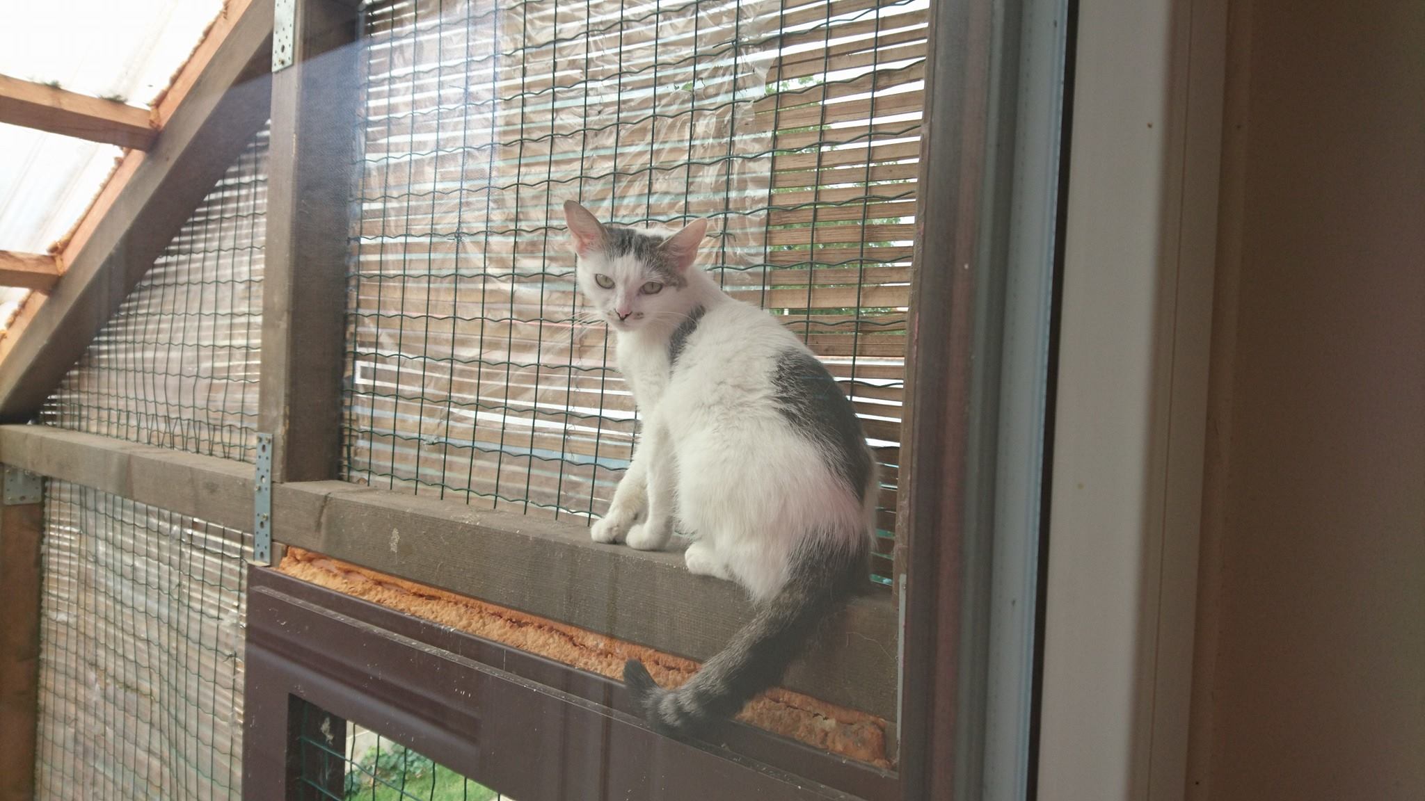 Kočička Pipa, která byla s její holčičkou Diankou přemístěna do voliéry k Tulince a Yzince, si zde stále nemůže zvyknout. Už je alespoň zalezlá v garsonce a nesedí na horním trámu. Je tak krásná, když je vyléčená, netečou jí očička, tak moc by si zasloužila klidný domov.